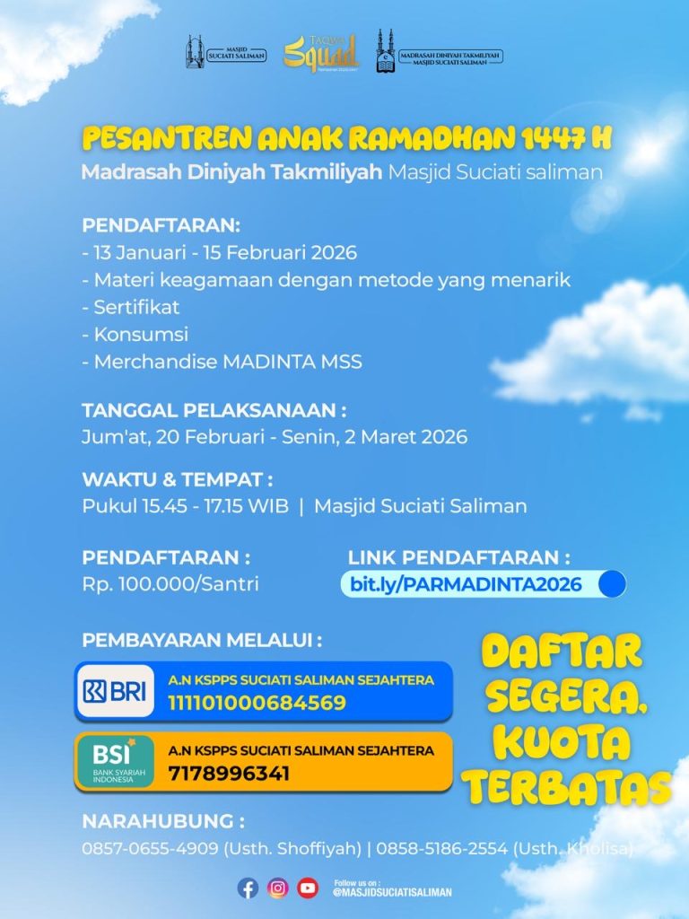 Di MADINTA MSS, kami mengusung tema Ramadhan Fun Learning: Belajar, Beramal, Berakhlak Mulia”. Di sini, anak-anak akan diajak menyelami indahnya Islam dengan cara yang asyik dan jauh dari kata membosankan.